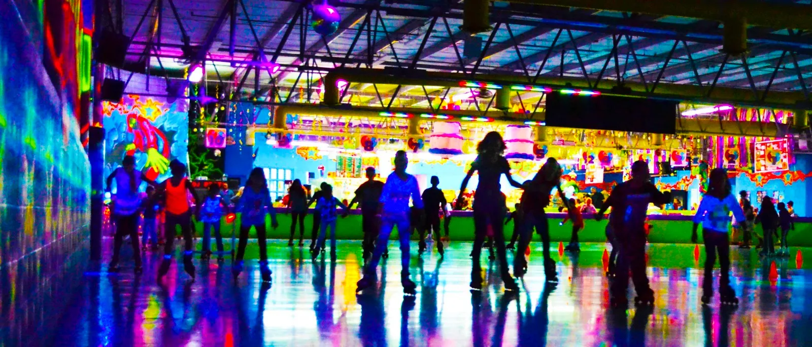 The focus of our facilities is always the beautiful, smooth rink in the center of all the action. Bordering the rink is plenty of seating for spectators and for skaters to relax, with colorful murals everywhere you look. Some rinks feature a collection of classic and modern arcade games, complete with a prize counter for redeeming tickets. A cafe featuring classics like pizza, soda, nachos, and pretzels keep guests fueled up during their stay.
