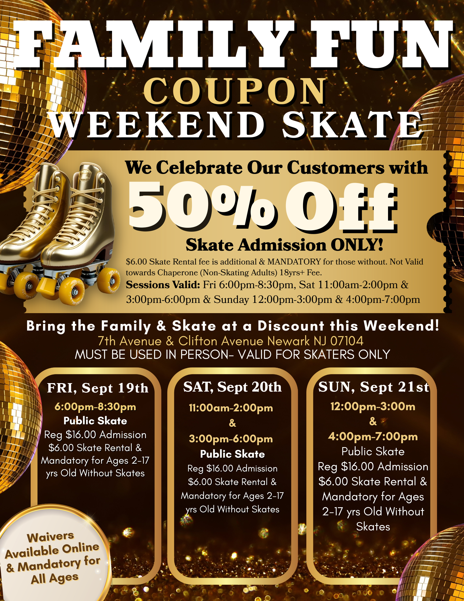 Redeem 50% off skating admission ONLY! Skate Rental is an additional $6.00 and is mandatory for those without skates!