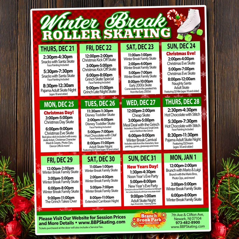Winter Break Roller Skating is Thursday, December 21, 2023 through Monday, January 1, 2023.