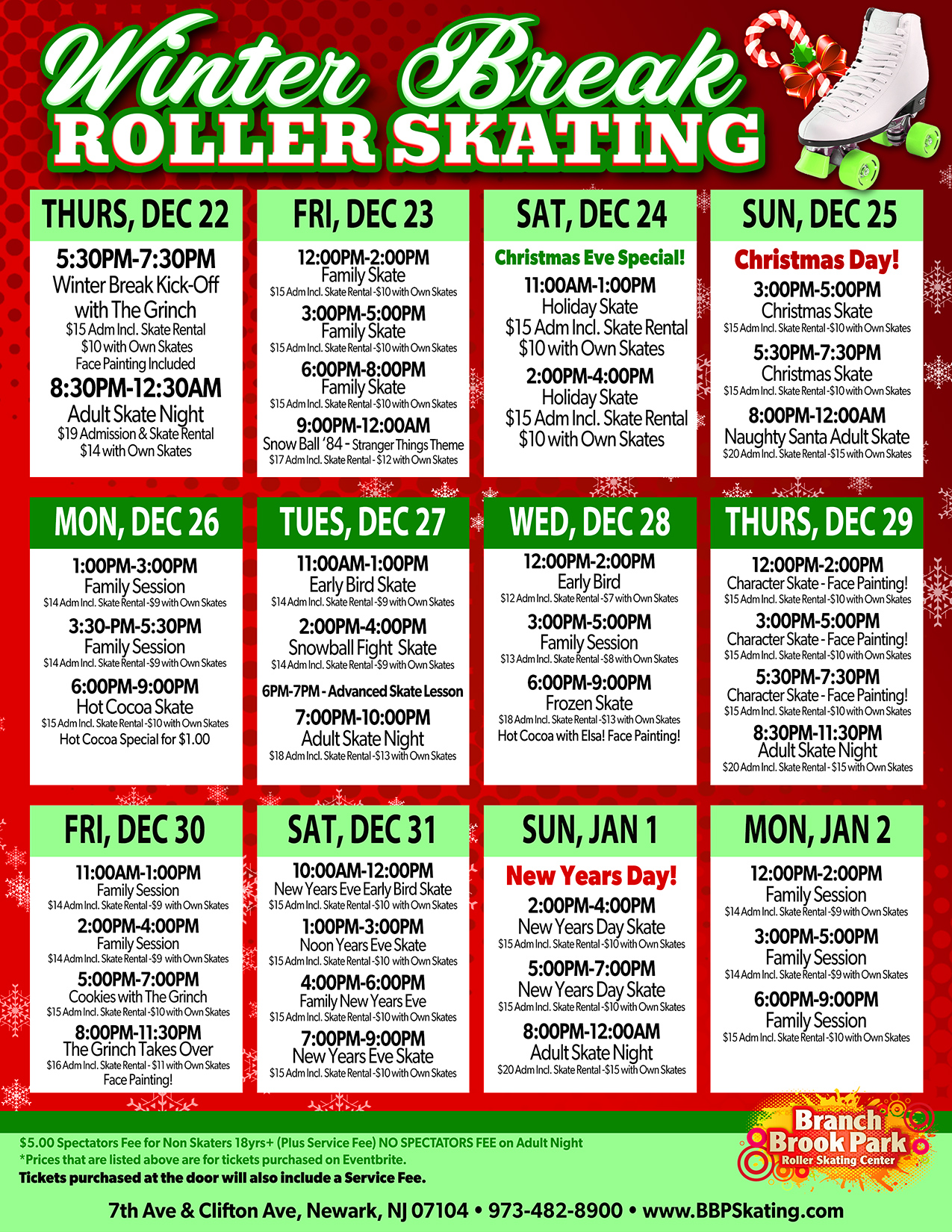Winter Break Roller Skating is Thursday, December 22nd 2022 through Monday, January 2nd 2023.