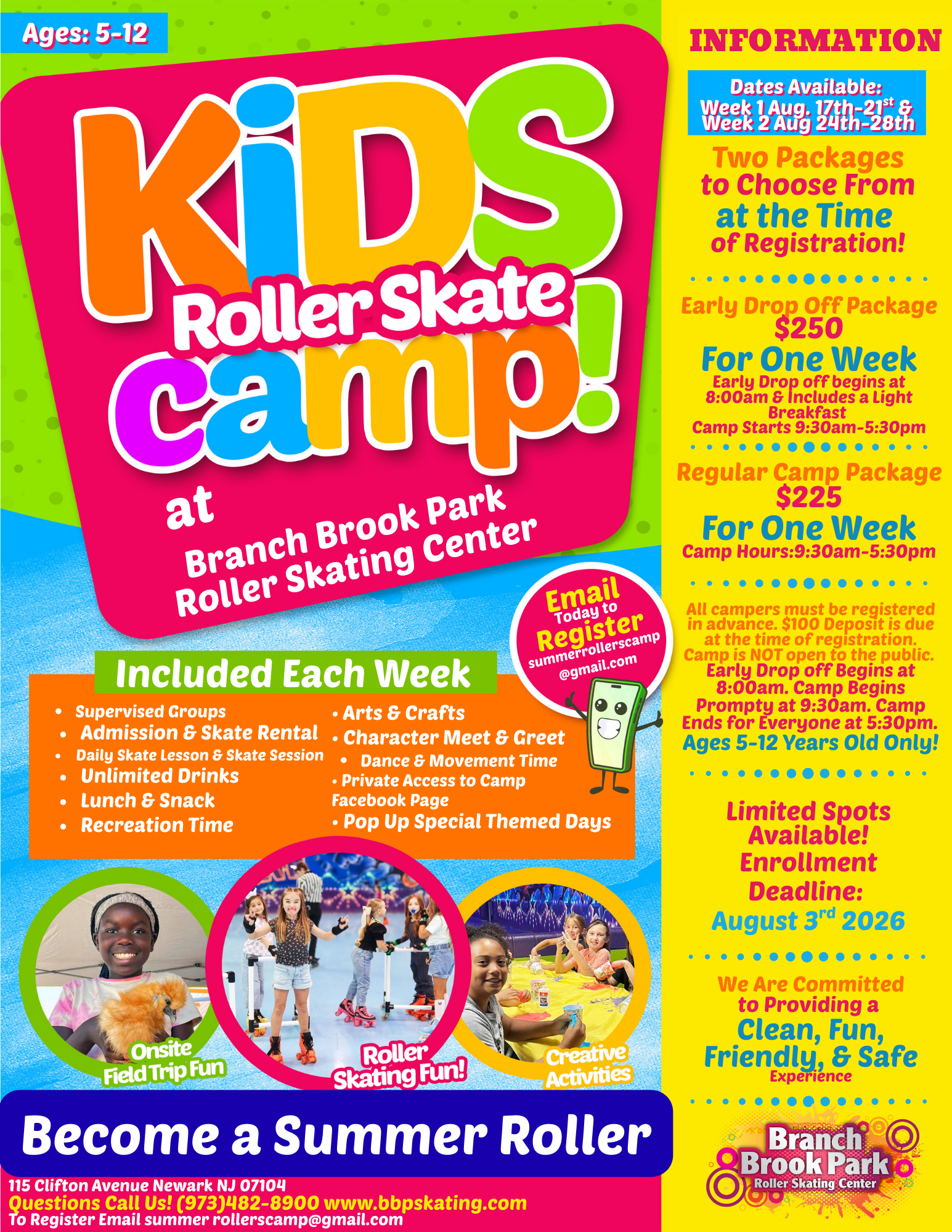 Roll into the summer at Skate Camp! Choose from four weekly sessions, or join us for all of them. Our camp counselors and kids aged 5-12 will have their days full of skating, arcade play, games, lunch, snack, and craft activities.
