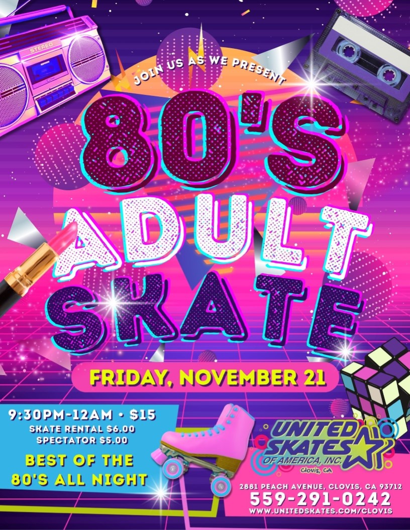 🎉 80’s ADULT SKATE 📅 Friday, Nov 21 | ⏰ 9:30PM–12AM 💸 $15 Admission | $6 Skate Rental | $5 Spectators 📍 United Skates of America, Clovis, CA
