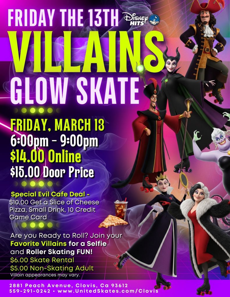 Are you ready to roll on the dark side? Join us for Villains Glow Skate, a glow-filled night of roller skating, music, and mischievous fun inspired by your favorite Disney villains! Dress to impress, skate under the lights, and snap selfies with villainous guests throughout the night.