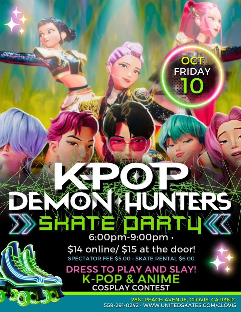 πΌπ₯ KPOP meets COSPLAY meets SKATE VIBES π₯πΌ Get ready to PLAY & SLAY at our KPOP Demon Hunters Skate Party! π Cosplay Contest π₯ Neon Lights πΆ K-pop Beats π Friday, Oct 10 | β° 6β9PM ποΈ $14 online / $15 door | π Spectators $5 | πΌ Rentals $6 π 2681 Peach Ave, Clovis, CA Dress to impress. Dance to express. Skate like a legend. #KpopSkateParty #CosplayOnWheels #UnitedSkatesClovis #PlayAndSlay
