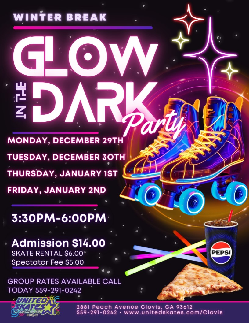 🛼✨ WINTER BREAK GLOW PARTY ALERT ✨🛼 Get ready to light up the rink at United Skates of America in Clovis! We’re turning down the lights and turning UP the glow for four epic afternoons of skating, music, and neon fun!