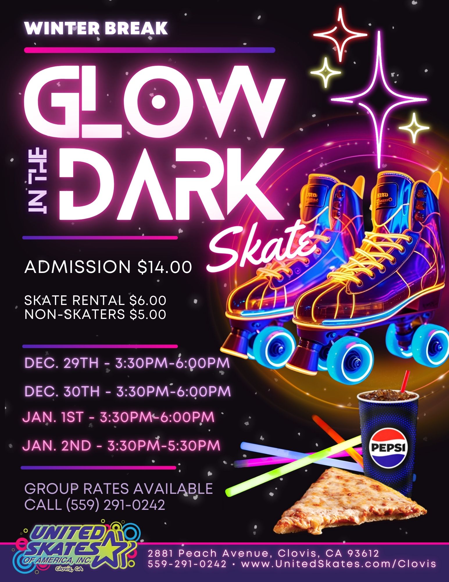 Tag your crew, wear your brightest neon, and let’s GLOW! 💥 #GlowSkateClovis #WinterBreakFun #UnitedSkatesVibes