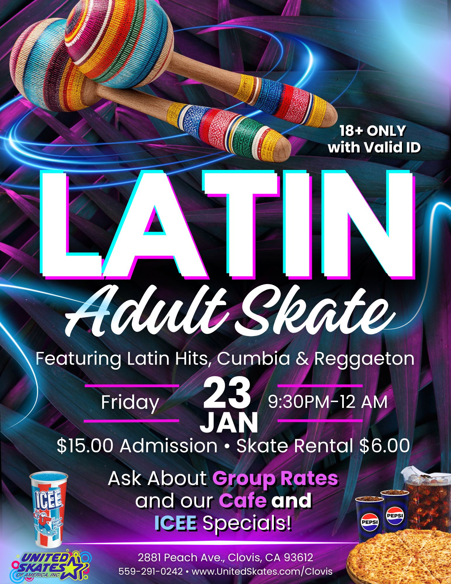 Get ready to roll into the rhythm! Join us for Latin Adult Skate, an exclusive 18+ skating event packed with the best Latin Hits, Cumbia, and Reggaeton. Whether you’re coming to dance on wheels or just enjoy the music and atmosphere, this is the perfect Friday night out!