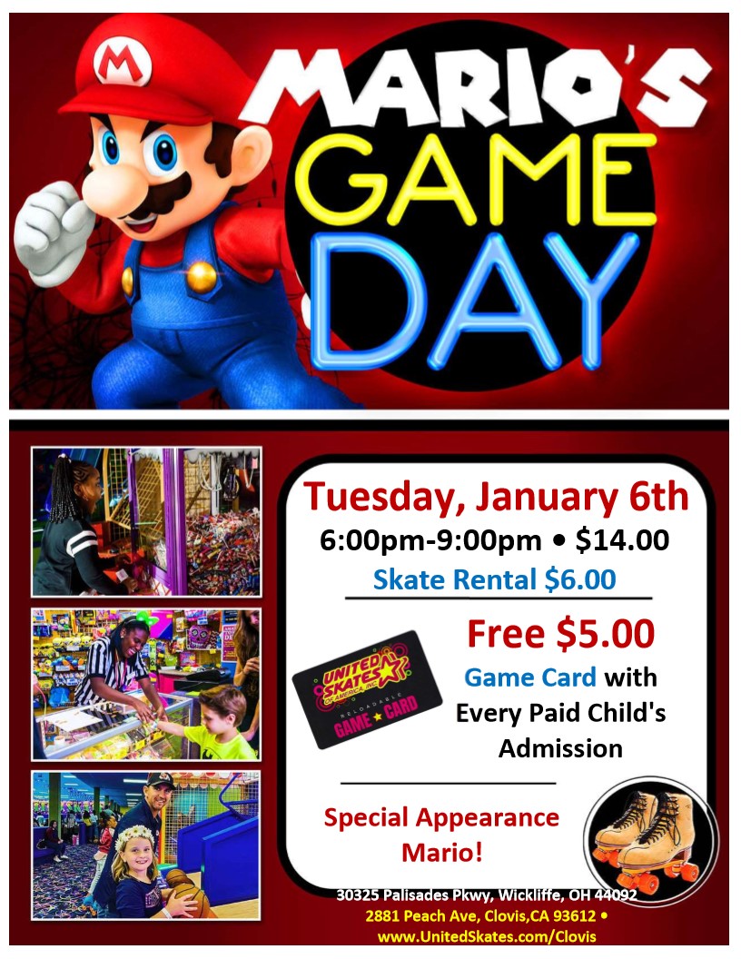 🎮🍄 IT’S-A ME, MARIO! 🍄🎮 Get ready for a night of games, skating, and superstar fun at Mario’s Game Day!