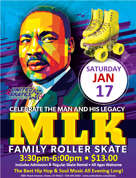 Join us Saturday, January 17th from 3:30PM to 6:00PM at United Skates Clovis for our MLK Family Roller Skate, a festive celebration filled with smiles, movement, and family fun 🎶💛