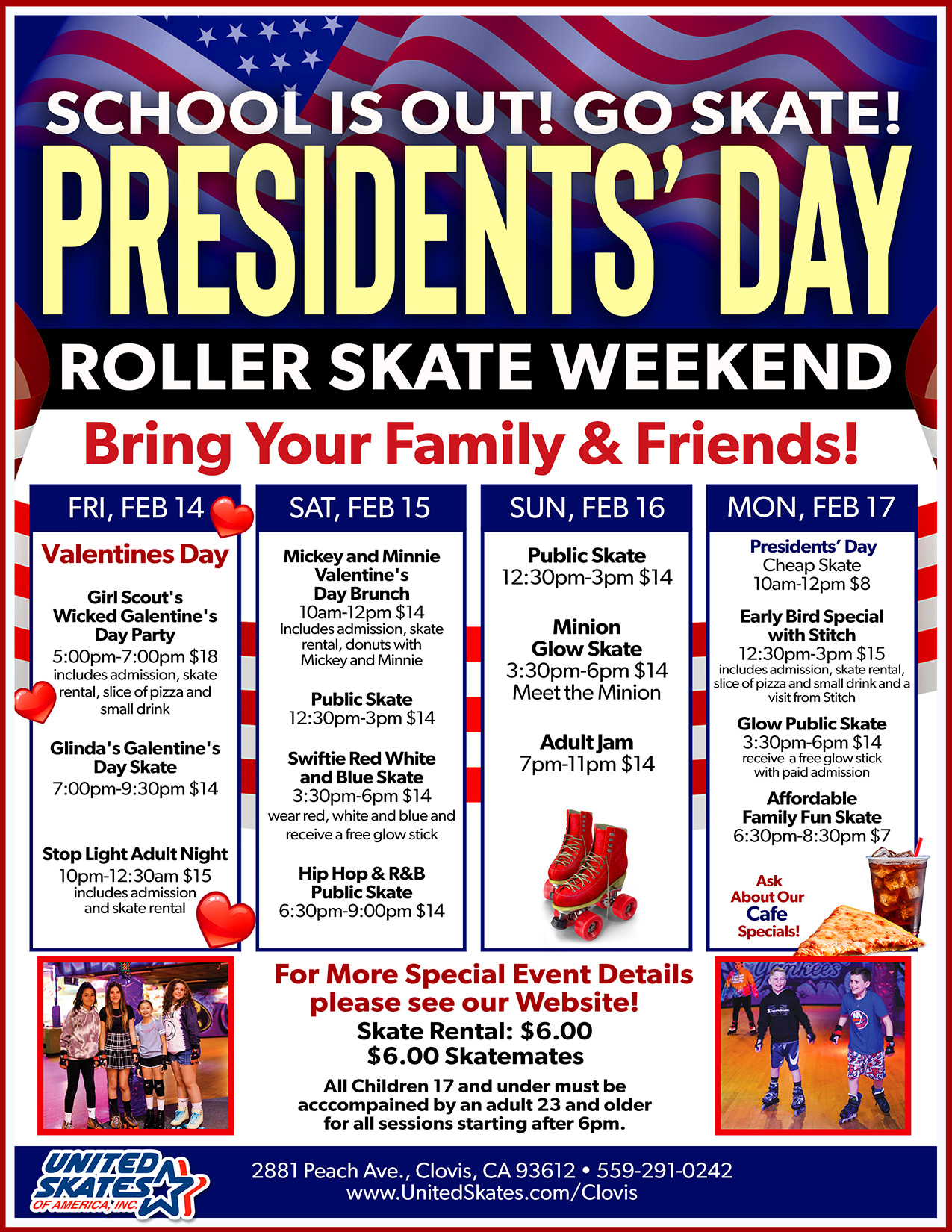 Looking for the perfect way to spend the long weekend? Join us at United Skates of Clovis for an exciting Presidents’ Day Weekend filled with themed skating events, character meet-and-greets, glow fun, and family-friendly excitement. Bring your friends and family for an unforgettable time on the rink!