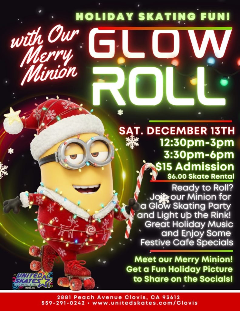 #GlowRoll #HolidaySkate #UnitedSkatesClovis #FamilyFun #MerryMinion #ClovisEvents