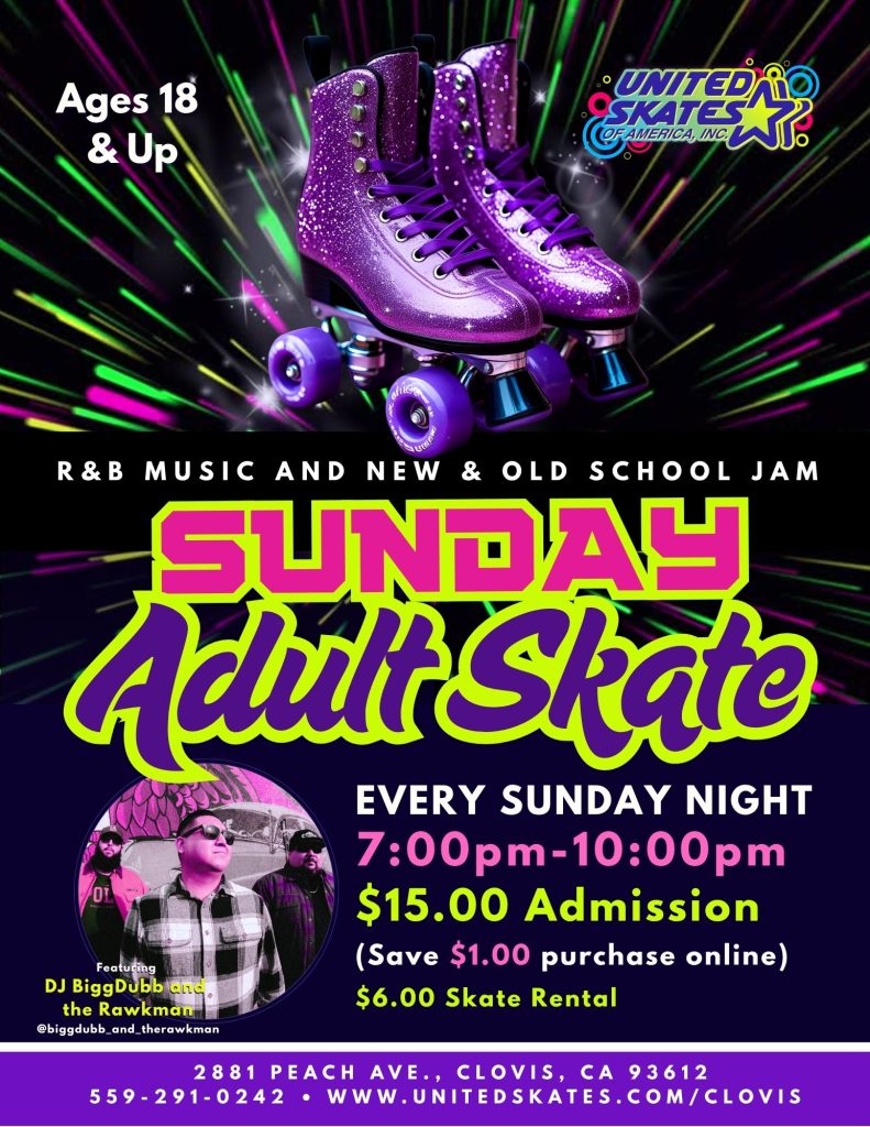 Join us every Sunday night from 7PM to 10PM at United Skates Clovis for the ultimate 18+ Adult Skate Jam 🎧 featuring live music by DJ BiggDubb and the Rawkman 🎤