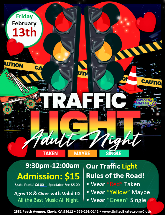 💃 Singles, taken, maybe… your shirt says it all. Lace up and roll into Traffic Light Adult Night — a night of music, mingling, and lights that match your love status.