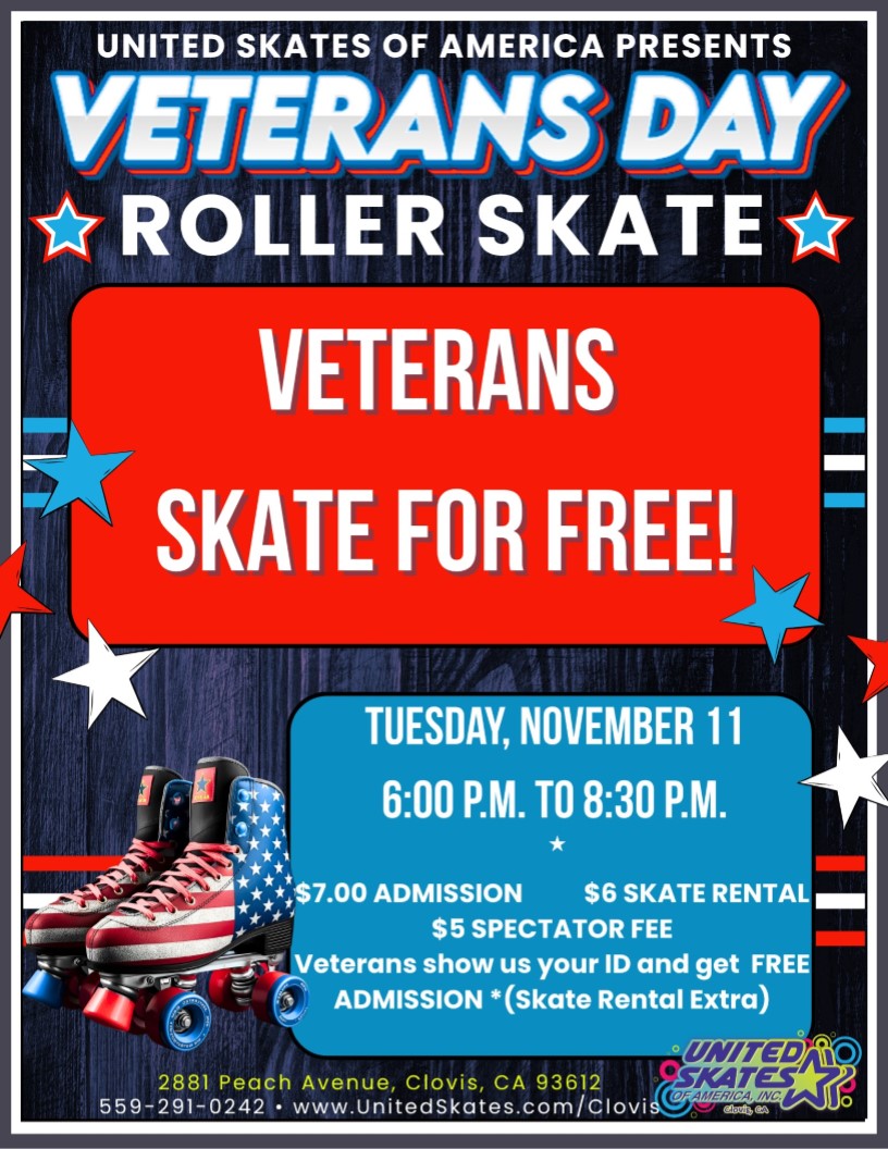 VETERANS DAY ROLLER SKATE We’re rolling out the red, white, and blue this Tuesday, Nov. 11 from 6–8:30 PM! 🎖️ Veterans skate FREE with ID — it’s our way of saying THANK YOU! 🛼 $7 Admission | $6 Skate Rental | $5 Spectator Fee 📍 United Skates of America, Clovis 📞 559-291-0242 | 💻