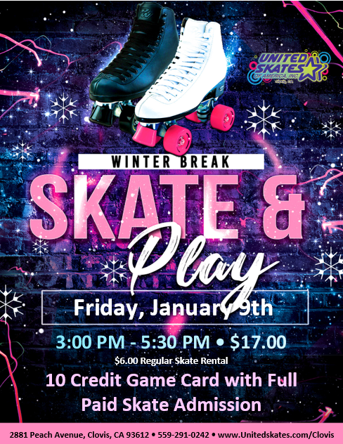 📅 January 9th 🕧 3:00 PM – 5:30 PM 📍 2881 Peach Avenue, Clovis, CA 📞 559-291-0242 🌐 unitedskates.com/clovis