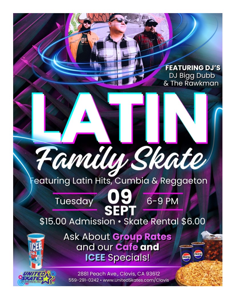 Latin Family Skate Night. Featuring Latin Hits, Cumbia & Reggaeton Tuesday September 9th from 6:00pm-9:00pm $15.00 admission $6.00 Skate Rental Spectators $6.00