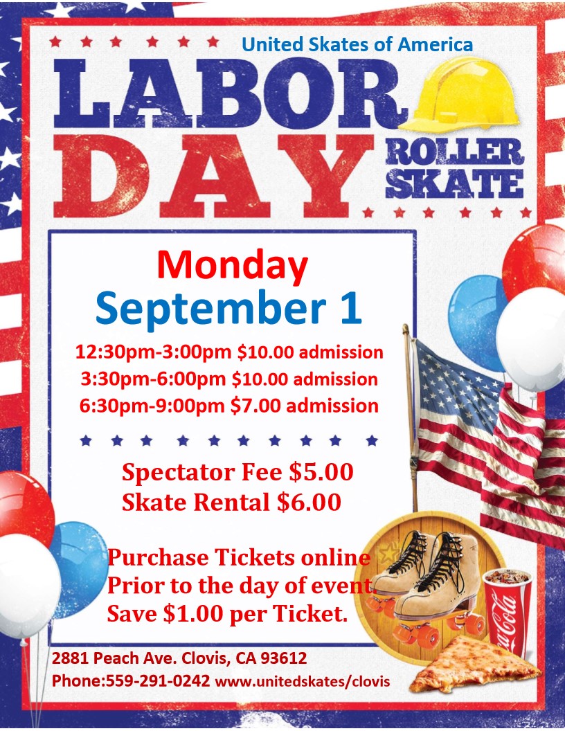 Labor Day Roller Skates 12:30pm-3:00pm $10.00 admission/$9.00 online 3:30pm-6:00pm $10.00 admission/$9.00 online 6:30pm-9:00pm $7.00 admission/$6.00 Online Spectator Fee $5.00 Roller Skate Rental $6.00