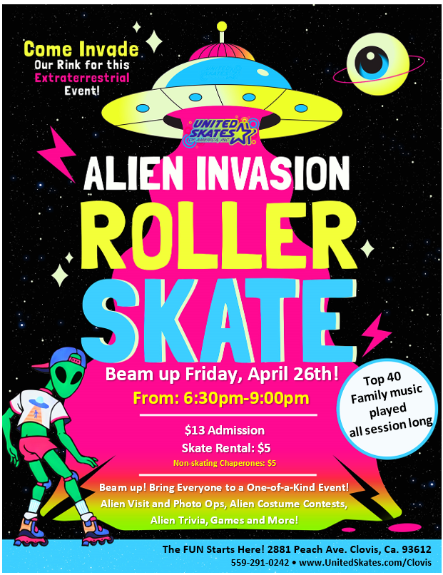 Celebrate National Alien Day with us. Alien costume contest, photo ops, special Alien cafe items for purchase, and more. $13 admissin $5 Skate rental $5 non skating spectator fee all minors must be accompanied by an adult atleast age 23.