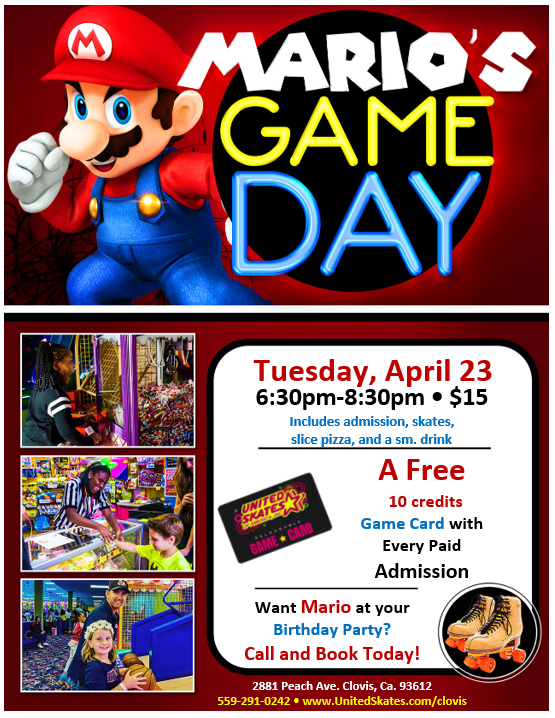 Enjoy a slice of cheese pizza, a small drink, 2 hrs of roller skating, and a 10 credit game card all for $15 Don't forget to bring your cameras for pictures with Mario