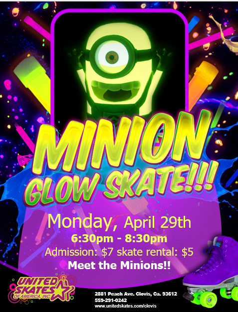 Meet the Minions Glow lights on all session Admission $7 skate rental $5 Adult non skating spectators $5