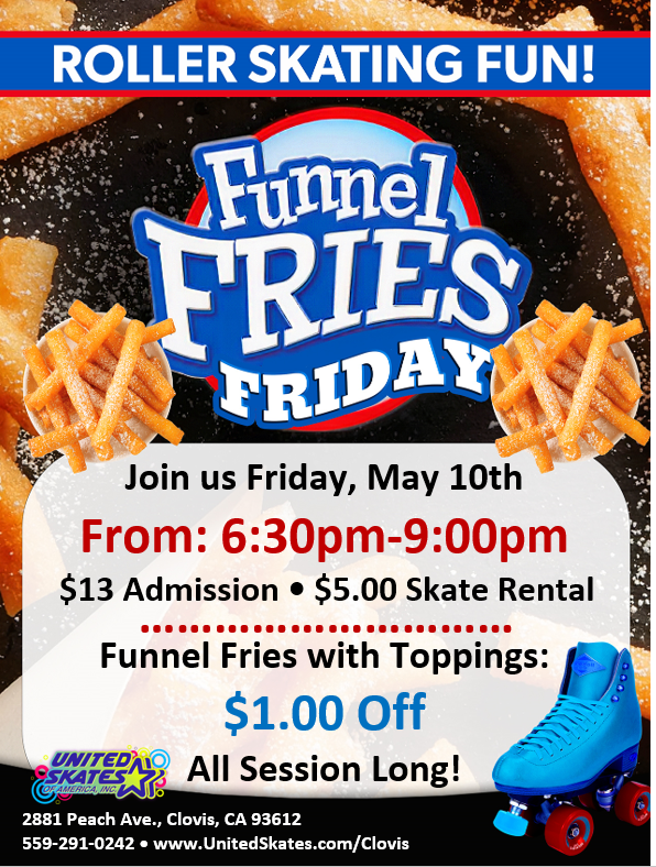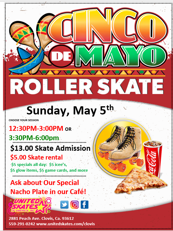 $13 admission$5 skate rentalCelebrate Cinco De Mayo at United Skates Clovis$5 specials throughout the day:$5 nachos, $5 glow items, $5 sodas and icees, $5 game cards, and more