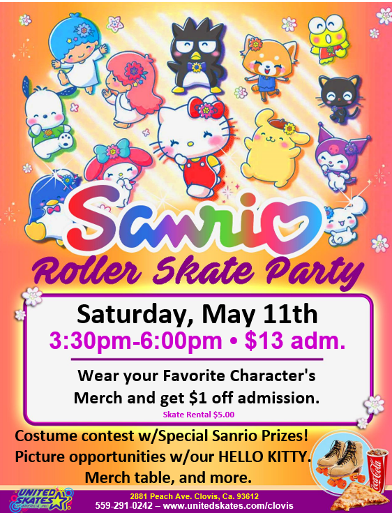 Admission $13 Skate rental $5 Wear your favorite Hello Kitty Merch and get $1 off your regular admission. Costume contest w/Special Sanrio Prizes! Picture opportunities w/our HELLO KITTY. Â Â Â Â Â Â Â Â Â Â Â Â Â Â Â Â Â Merch table, and more.