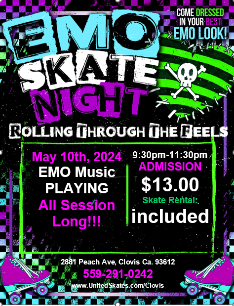 Come dressed in your best EMO look Admission $13 includes skate rental EMO music all session
