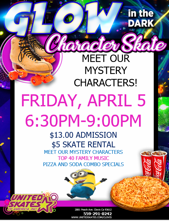Glow lights on all session Meet our mystery characters throughout the session Glow specials, cafe specials and more. All minors must be accompanied by an adult atleast age 23 Admission $13 Skate Rental $5 non skating adult spectators $5