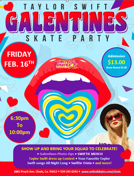 $13 admission $5 skate rental 3 1/2 hr. session Taylor Swift dress up contest Swiftie merch table skate to your favorite Taylor Swift songs all session long. ****ATTENTION ALL GIRL SCOUTS/TROOPS: CALL US FOR SPECIAL EXCLUSIVE EARLY ENTRY AND PRICING FOR OUR GALENTINE PUBLIC SESSIONÂ 559-291-0242 EXT 302