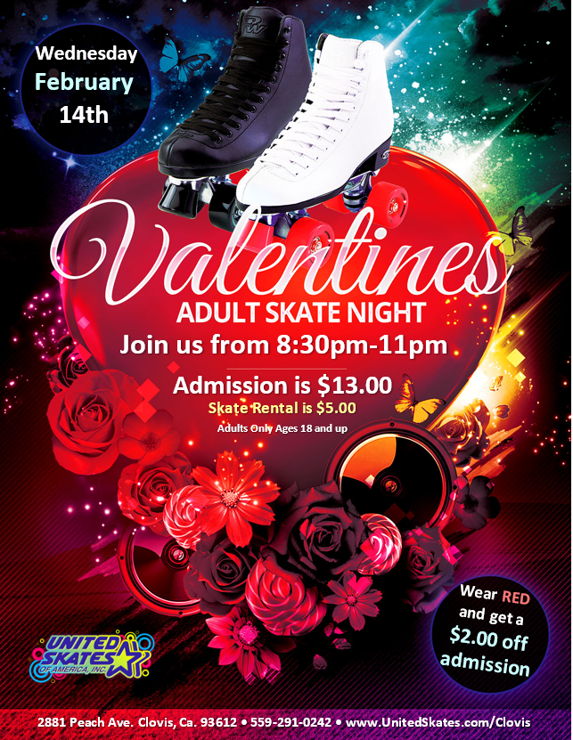Adults only ages 18+ $13 admission $5 skate rental Wear RED and get $2 off your regular admission rate.