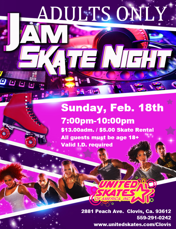 Adult Jam Skate $13 admission $5 skate rental Must be age 18+ Valid I.D. required Join us from 615pm to 7pm for our Jam lessons for only $5 per adult.