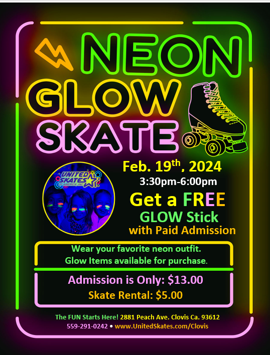Receive a FREE glow Stick with each regular paid admission of $13 Skate rental: $5 Adult spectators $5