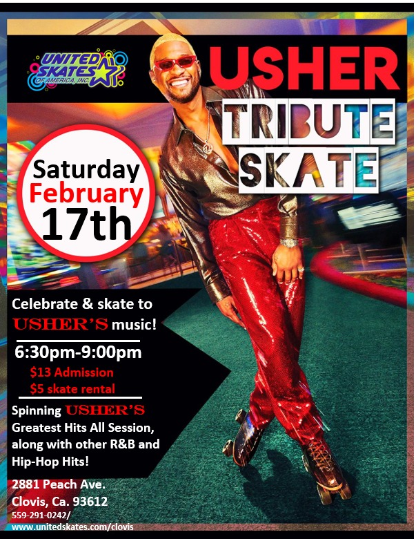 Join us for our Usher Skate Spinning all your favorite Usher Hits along with other R&B and Hip Hop favorites Admission $13 Skate Rental $5