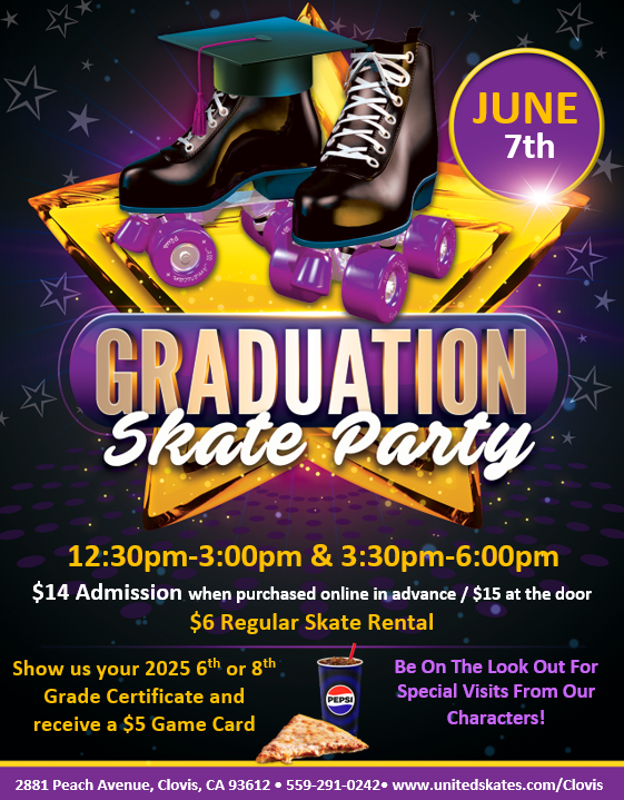 📍 United Skates of America – Clovis📅 Saturday, June 7, 2025🕖 Time: 12:30 PM – 3:00 PM💲 Admission: $14 when purchased online in advance, $15 at the door| Skate Rental: $6