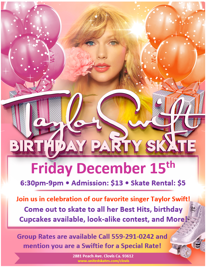 Swifties and friends: Join us as we celebrate Taylor Swifts Birthday Trivia Look Alike contest Birthday cupcakes lip-sync battle and more $13 admission $5 skate rental