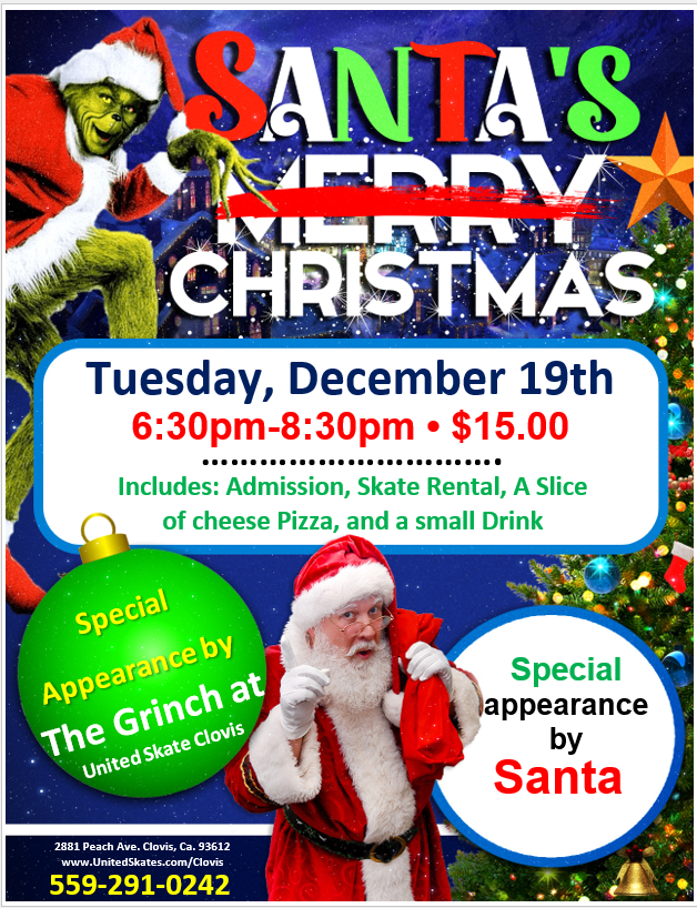 Admission $15 includes admission, skate rental, 1 slice of cheese pizza, and a small drink Visit from Santa and the Grinch