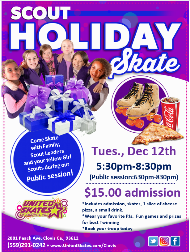 Wear your PJs.  Games and prizes for best Twinning ***Scouts/Troops are invited to come in early: 5:30pm Call today to book your troop 559-291-0242 Public session: 6:30pm to 8:30pm $15 admission includes: admission, skate rental, slice of cheese pizza and a small drink