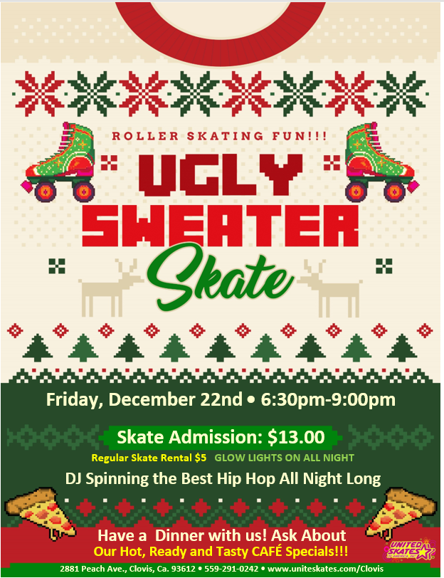 Kick off winter break with our Ugly Sweater Christmas Glow skate. Come skate to your favorite Hip Hop music Admission $13 Skate Rental: $5 Ugly sweater contest. Glow lights on all Session