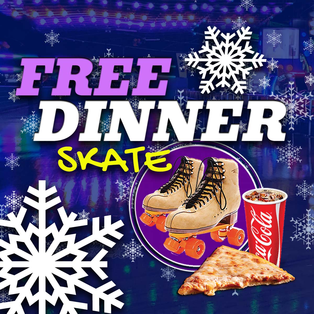 Enjoy a free slice of cheese pizza and a small drink with each paid regular admission of $15. Skate rental included Skate to your favorite holiday music