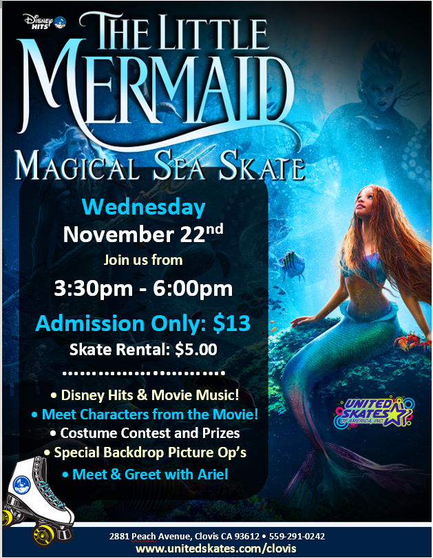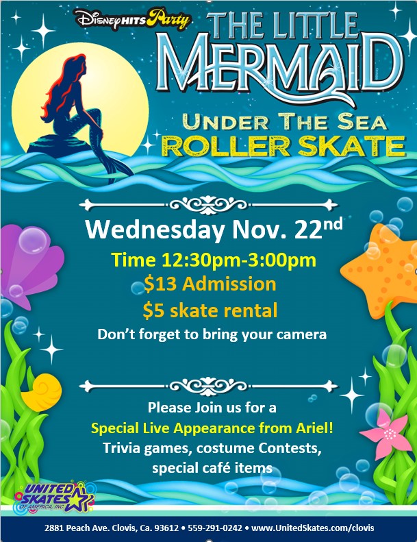Admission: $13 Skate Rental: $5 special visit from Ariel Under the sea activities