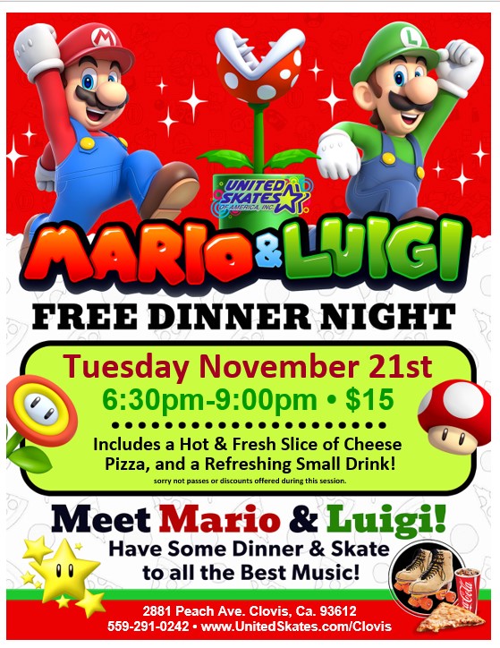 Bring your cameras to take pictures with Mario and Luigi Skating 6:30pm to 9:00pm $15 includes admission, skate rental, a slice of cheese pizza, and a small drink