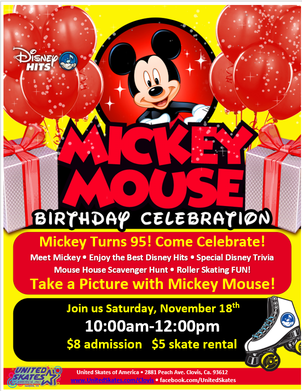 Admission: $8 Skate Rental: $5 Bring your cameras for pictures with Minnie and Mickey Confetti cannon dance party at the end of session.