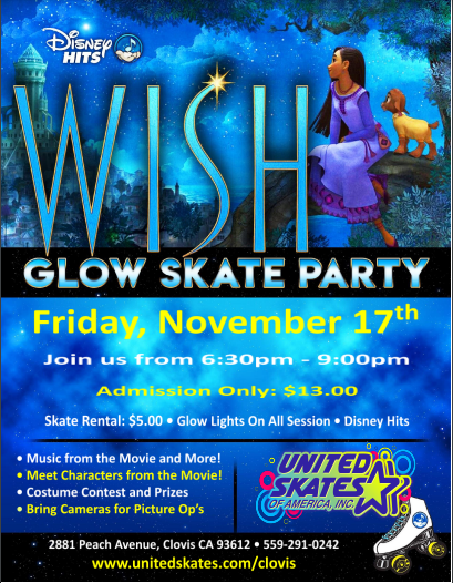$13 admission $5 skate rental Picture opportunities Disney Wish movie songs Glow lights on all night All minors must be accompanied by an adult at least 23 years of age