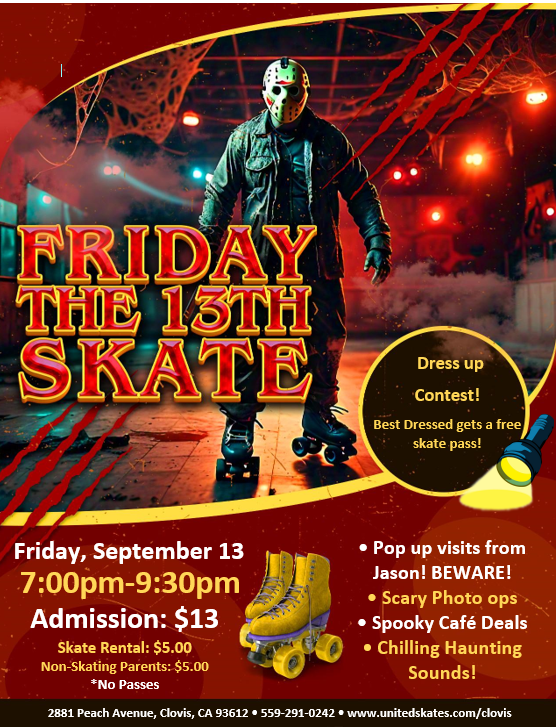 Its Spooky Season! Come Show Your Halloween Spirit Choose Freddy or Jason Costume Contest Admission: $13.00 Skate Rental: $5.00 Top 40 Music
