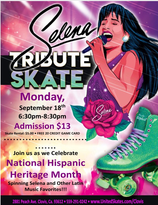 Skate to your favorite Selena Songs $13 admission $5 skate rental receive a free 20 credit game card