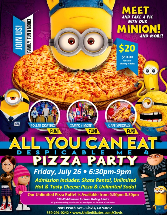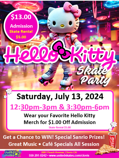 United Skates Of America Clovis 2881 Peach Ave., Clovis, CA, United StatesWear Your Favorite Hello Kitty Merch for $1.00 Off Admission Admission $13 Skate rental $5 Adult spectators $5 ALL adults, skating and non skating, must fill out our waiver card
