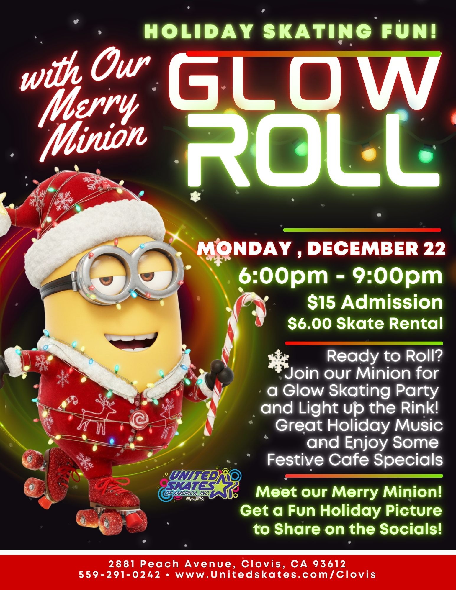 🎄✨ Holiday Skating Fun at United Skates of America – Clovis! ✨🎄 Grab your glow gear and join us for our GLOW ROLL featuring our Merry Minion! 🛼💛 🗓 Monday, December 22nd🕐6:00 PM – 9:00 PM💲 Admission: $15 | Skate Rental: $6 Light up the rink with glowing fun, great holiday music, and festive café specials! 🎅🎶Plus — meet our Merry […]