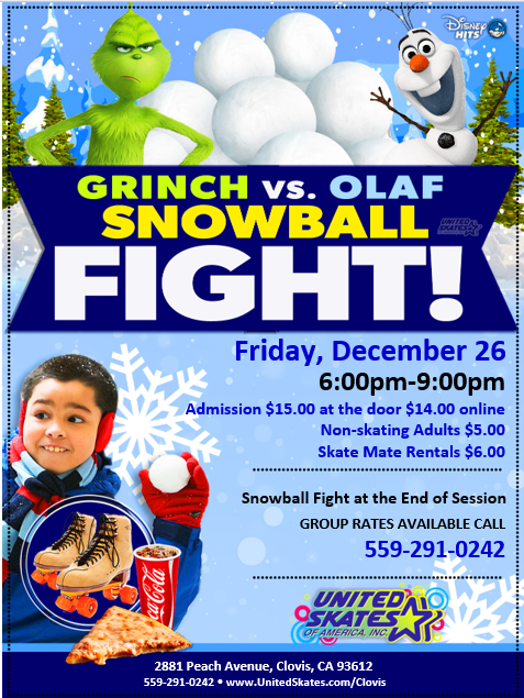 ❄️GRINCH vs. OLAF: WHO WILL WIN THE SNOWBALL SHOWDOWN? ⛄️❄️ Join us Friday, December 26th from 6:00pm–9:00pm for the ultimate indoor snowball fight at United Skates of America, Clovis! 🎯 Pom-pom snowball battle at the end of the session 🧊 Yummy ICEEs + Glow Sticks available 🎟 Admission: $15 at the door / $14 online 👟 Skate Rental: $6 | Non-Skating Adults: $5 Bring your friends, your winter spirit, and your […]