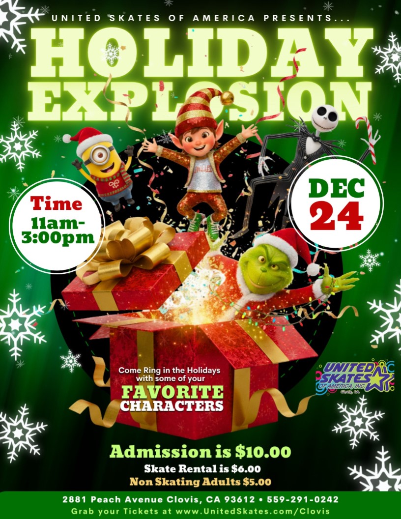 🎁🎄 HOLIDAY EXPLOSION 🎄🎁 Get ready to ring in the holidays with a blast of festive fun at United Skates of America, Clovis! 🎉 Join us on December 24th from 11am–3pm for a magical afternoon featuring some of your FAVORITE CHARACTERS—Minions, Jack Skellington, the Grinch, and more! 🛼 Admission: $10 🛼 Skate Rental: $6 👀 […]