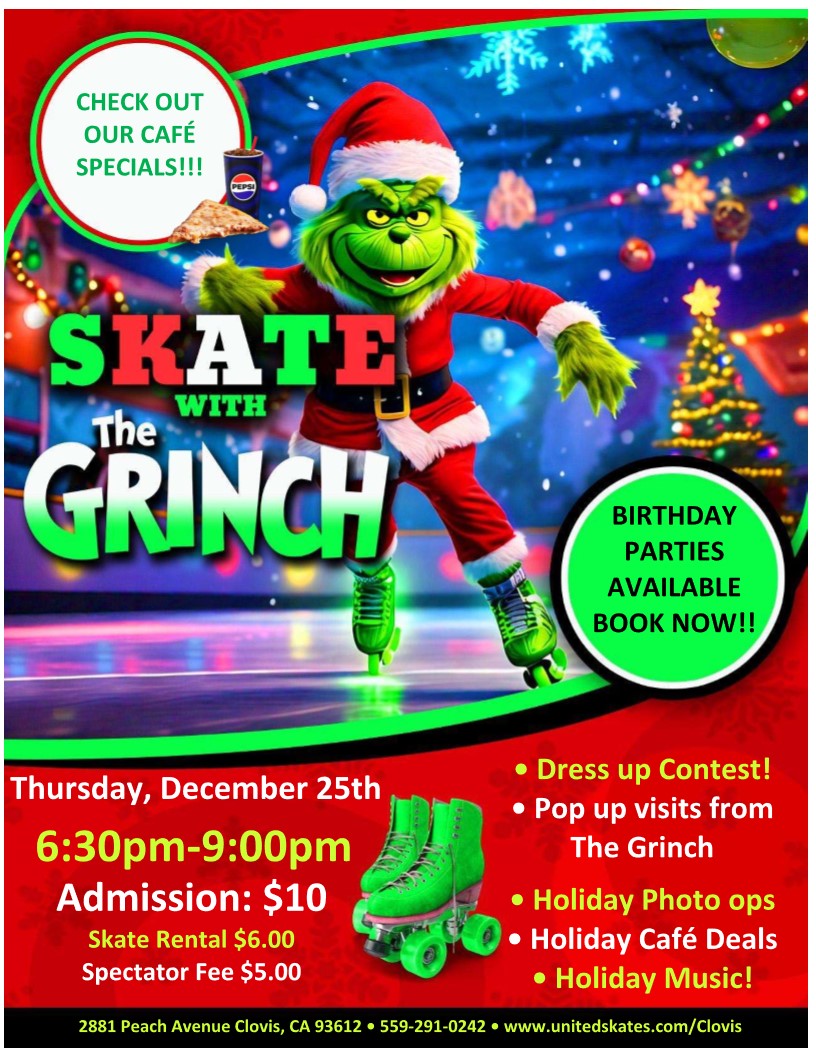 🎄💚 SKATE WITH THE GRINCH 💚🎄 Get ready for a night of holiday mischief and magical memories! The Grinch is lacing up his skates and sliding into Clovis for one unforgettable evening! 🗓️ Thursday, December 25th 🕡 6:30pm–9:00pm 📍 United Skates of America – Clovis, CA 🎁 What’s in store: ✨ Pop-up visits from The […]